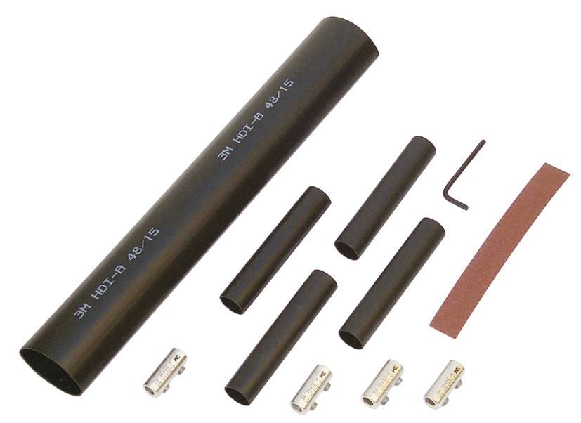 Die 3MT Warmschrumpfverbindungsgarnitur der Serie 91-AHSC mit Schraubverbindern ermöglicht eine einfache, schnelle und sicherer Kabelverbindung und ist für alle gängigen Kunststoffkabel mit PVC- oder VPE-Isolation in der Niederspannung geeignet. Dabei können Sie sie sowohl im Innen- als auch im Außenbereich und zur Erdverlegung einsetzen. Aufgrund ihrer hohen Schrumpfrate deckt sie einen großen Querschnittsbereich ab, weshalb nur wenige Größen für eine Vielzahl von Verbindungen nötig sind. Die Verbindungsgarnitur ist äußerst alterungs- und chemikalienBeständig und verfügt über eine sehr gute mechanische Festigkeit. Eine Garnitur enthält einen dickwandigen Außenschlauch, vier beziehungsweise fünf Innenschläuche, ebenso viele Schraubverbinder, einen Sechskantschlüssel und Schmirgelleinen. Die Schraubverbinder sind für Kupfer- und Aluminiumleiter geeignet und benötigen kein Spezialwerkzeug.