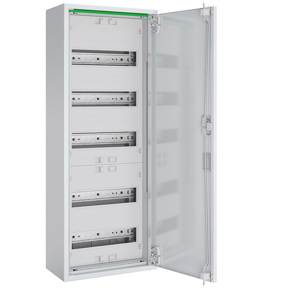 Komplettschrank für Aufputzmontage bestehend aus: RM-Gehäuse mit Volltür, 1x Verteilerfeld 5-reihig, 60 TE, für Reiheneinbaugeräte, mit PE/N-Steckklemmen, IP44