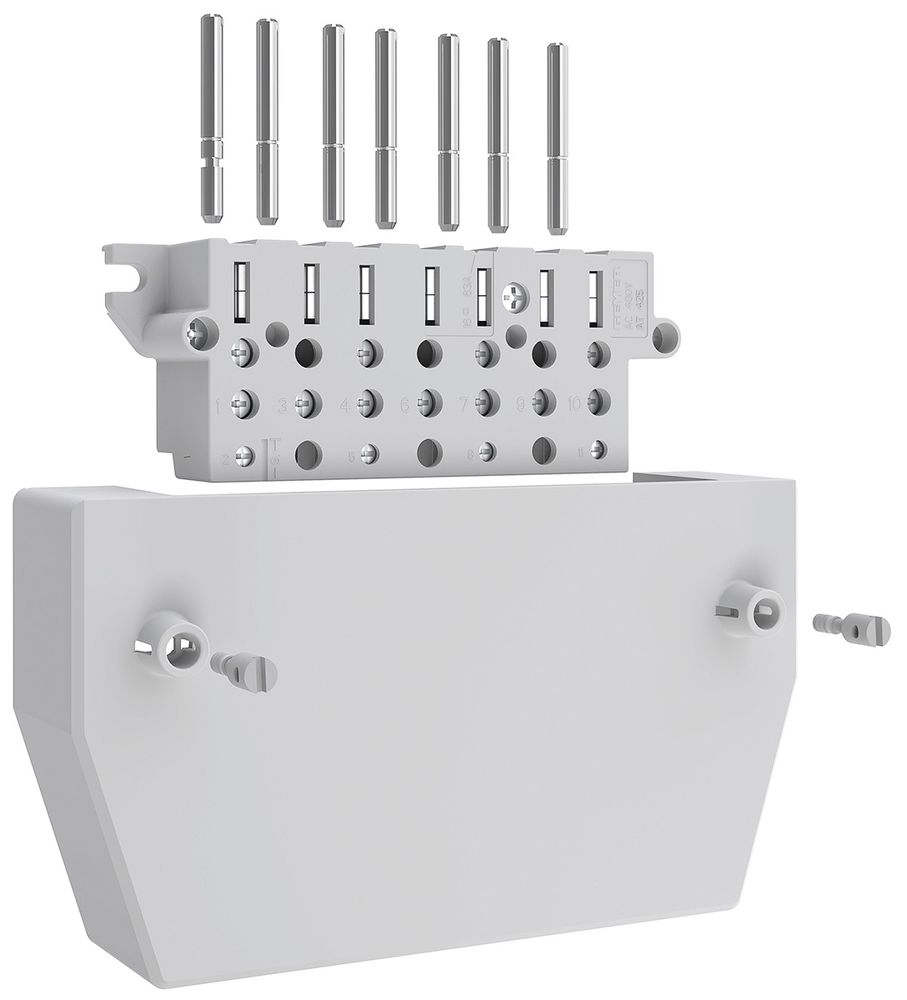 Zählersteckklemme mit Steckstifte und Klemmenabdeckung für 3 Phasen Drehstrom, geprüft nach DIN VDE 0603-3-3, für das schraublose Wechseln von haushaltsübliche Bezugszähler (63 A) in 3-Punkt-Befestigung, Klemmenquerschnitt bis 16 mm², Steuerleitungsabgriff pro Phasen- und N-Klemme, Set mit 7 Kontaktstiften mit Arretierung N-Stift 6x 45 mm und 1x 45 mm, plombierbar und mit Berührungsschutzabdeckung bei demontierten 3 Phasen-Wechselstromzähler
