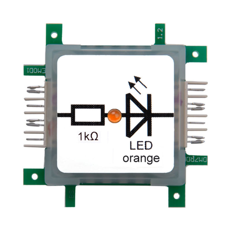 Die orange LED (Light Emitting Diode) ist mit einem Vorwiderstand vor Überlastung gesichert. Sie leuchtet nur, wenn die Diode in Flussrichtung geschaltet ist also der Strom von Anode zur Kathode fließt. LEDs benötigen eine Mindestspannung in Flussrichtung, damit sie leuchten. Bei orangen LEDs liegt diese bei ca. 1,8V.