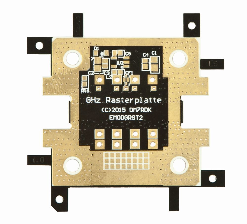 Aufbau von Filtern, Abschwächern, MMIC Verstärkern, MD-Quarz-Oszillatoren (5x3.2mm) Optionaler Spannungsregler auf der Unterseite. Stecker P-SMP beidseitig von Firma Rosenberger. Alternativ /SMA/RPC292/RPC24.