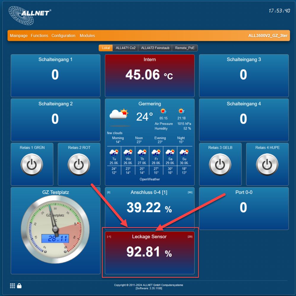 - inkl. 2m Kabellänge zum Schwimmer der am Boden die Leitfähigkeit der Flüssigkeit registriertBeispielansicht in WebGUI: Sensor-Informationen: