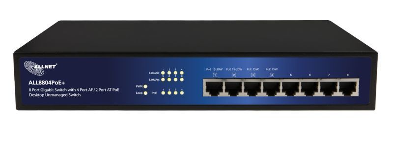 Der Artikel Allnet ALL8804PoE unmanaged 8 Port Giga.HPoE Switch, 2x PoE+ oder 4x PoE ist derzeit auf Lager