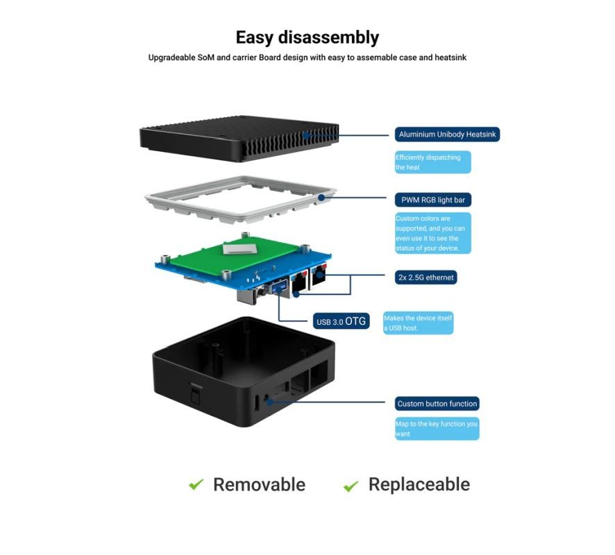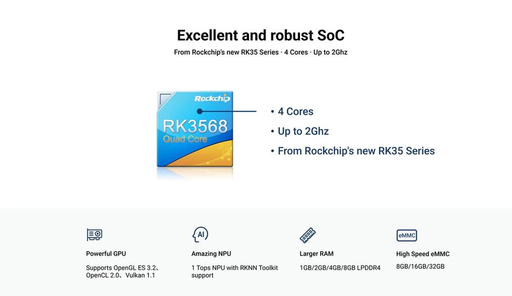 Hardware-Übersicht:Aufrüstbares SoM und Carrier Board Design mit einfach zu montierendem Gehäuse und Kühlkörper Rockchip RK3568 mit Quadcore Cortex-A55 (ARM v8) 64-bit SoC @ 2.0GHz Mali G52-GPU, unterstützt OpenGL ES 3.2/OpenCL 2.0/Vulkan 1.1 1Tops NPU mit RKNN Toolkit Unterstützung 1GB/ 2GB/ 4GB/ 8GB LPDDR4 RAM Erweiterung über M.2 und mini PCIe Schnittstelle für 4G/5G Mobilfunknetz Schnittstellen:1x USB C für Stromversorgung und serielle Konsolenverwaltung 2x 2.5G-Ethernet 1x M.2 Anschluss für 4G LTE Netzwerk oder M.2 SATA 2242 1x mini PCIe-Anschluss für AP WiFi oder 5G-Mobilfunknetz 1x SD-Karte für Speicher oder OS 1x Nano-SIM-Kartensteckplatz 1x USB3 Typ A 5Gbps OTG Anschlüsse 1x Benutzertaste 26x Benutzer-GPIO, die verschiedene Schnittstellenoptionen unterstützen: - bis zu 3 x UART