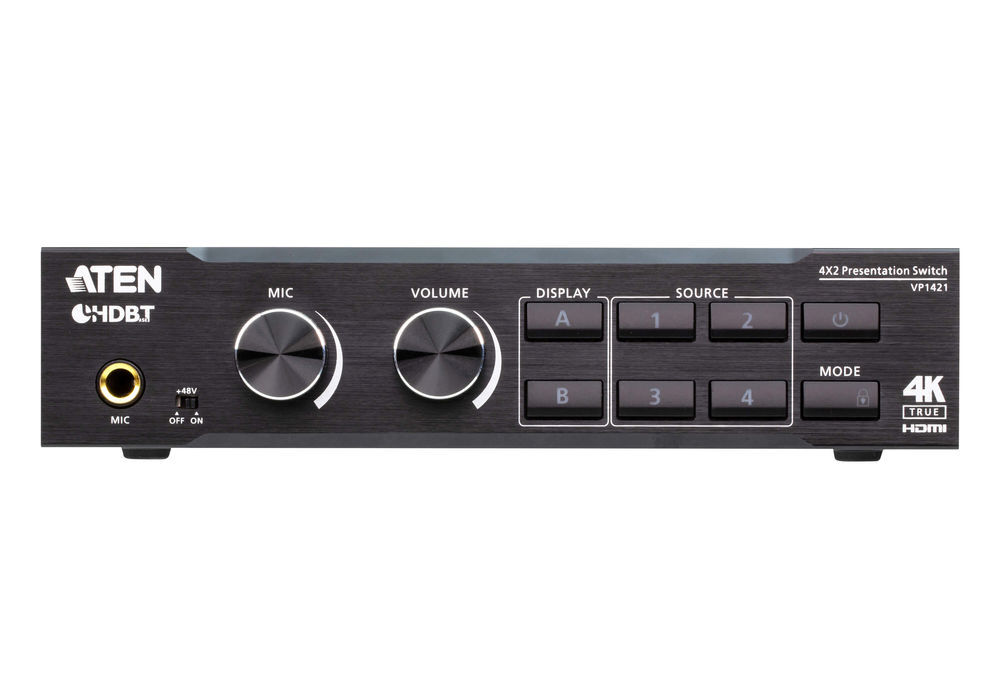 Aten Video Switch, 3xInput(HDMI/VGA/HDBaseT), 2xOutput(HDMI/HDBaseT), 4 x 2 True 4K Präsentation, DSP und HDBaseT-Lite
