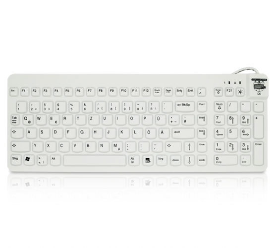 Die Really Cool Low Profile medizinische Silikontastatur von Man&Machine zeichnet sich besonders durch ihre optimierte Tastenhöhe aus. Diese Silikontastatur ermöglicht eine einfache Reinigung und bietet gleichzeitig das Gefühl einer modernen Laptoptastatur. Die vollständig versiegelte, fugenlose medizinische Tastatur hält regelmäßigen Reinigungen mit Oberflächendesinfektionsmitteln, wie zum Beispiel alkoholbasierten Lösungen, problemlos stand. Während des Reinigungsprozesses kann die Really Cool Low Profile Tastatur mit dem Tru-Lock-Mechanismus gesperrt werden, um ungewollte Eingaben zu vermeiden.