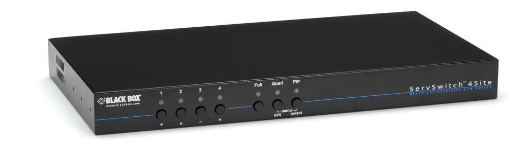 BlackBox KVP4000A-R3 ServSwitch 4Site II 4 PCs simultan in Echtzeit überwachen und steuern Quad-Vollbild oder Bild-in-Bild-Modus Auflösung bis 1920 x 1200 Unterstützt PS/2 und USB Arbeitet mit VGA und DVI-Grafikkarten 48,3 cm ( 19 Zoll ) Rackeinbaugehäuse Lieferumfang: 1) ServSwitch 4Sig