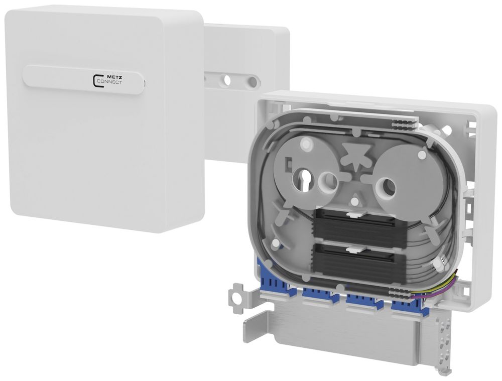 Kompakter LWL-Abschlusspunkt für den FITH-Bereich, vorbereitet zur Aufnahme von Microrohren inkl. Gasblocker, plombierbar oder durch Sicherheitsschraube verschließbar, bestückt mit Kupplungen mit Lasershutter und Pigtails, Pigtails mit Singlemodefaser OS2, E9/125 µm, IEC 60793-2-50 B.1.3 und B.6_a, biegeunempfindlich nach ITU-T G.657.A1, kompatibel zu ITU-T G.652.D , Pigtails gereinigt und in Kupplungen eingesteckt, nicht belegte Ausbrüche mit Blindstopfen verschlossen, zur Aufputzmontage und mit integrierten Clips für die Tragschienenmontage in zwei Richtungen, schwenkbare, abnehmbare Spleißkassette für bis zu 8 Crimpspleißschutze, Deckel werkzeuglos abnehmbar, Steckrichtung 90°, Farbe der Abdeckteile reinweiß RAL 9010, Varianten: bestückt mit SC APC, SC UPC, LC-D APC oder LC-D UPC Kupplungen und passenden Pigtails, Varianten auch in Grade B erhältlich