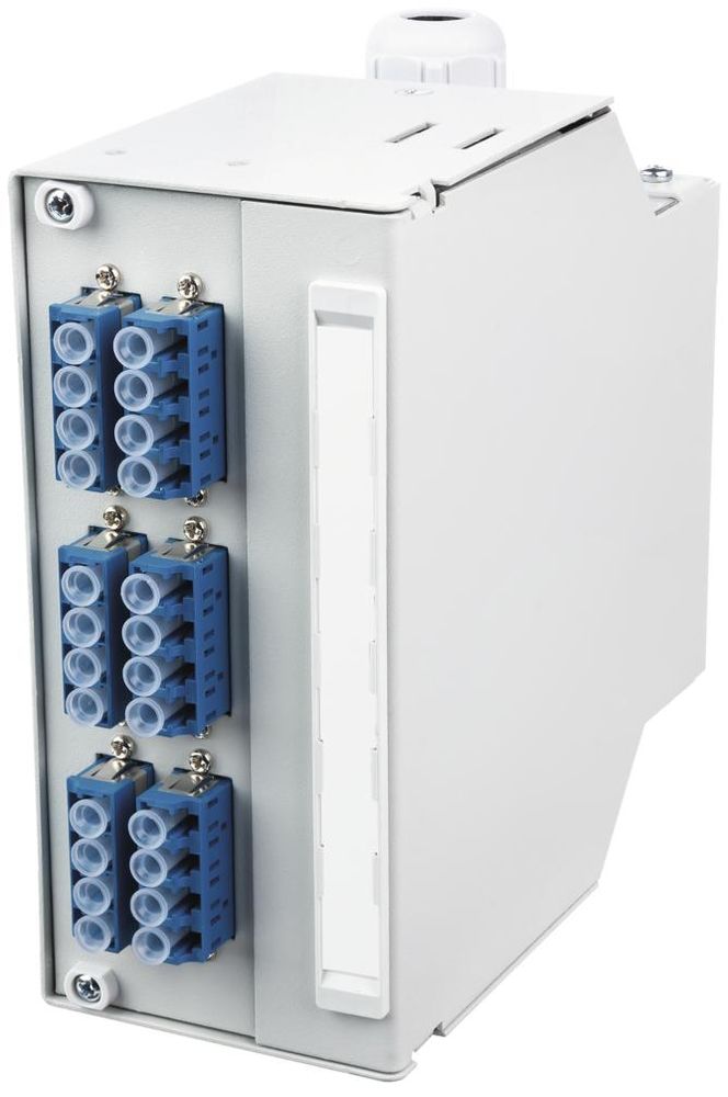 Kompaktes Verteilergehäuse für TH35-Tragschienensysteme, Geeignet zum Spleißen von Installationskabeln, schnellere Installation durch zum Spleißen vorbereitete Pigtails, bestückt mit LC-Q Kupplungen und LC-Pigtails, Pigtails mit Kompaktader ø 0,9 mm, 12 Farben, Sekundär- und Primärcoating gleichgefärbt, Länge 2,0 m, Pigtails in Spleißablage mit Crimpspleißhaltern eingelegt und abgesetzt, Pigtails gereinigt und in Kupplungen eingesteckt, Frontbereich mit Beschriftungsstreifen, Verschiedene Montagepositionen am Hutschienensystem möglich, Kabelzuführung von oben oder unten, gerade oder schräg, mit M20-Verschraubung (bis zu 2 möglich), Zwei Kabeleinführungen M20 mit Zugentlastung im Lieferumfang enthalten, Freie Kupplungsaussparungen mit Blindabdeckungen bestückt, Gehäuse aus Stahlblech, pulverbeschichtet (lichtgrau, RAL 7035), Varianten: bestückt mit maximal 6 LC-Q Kupplungen