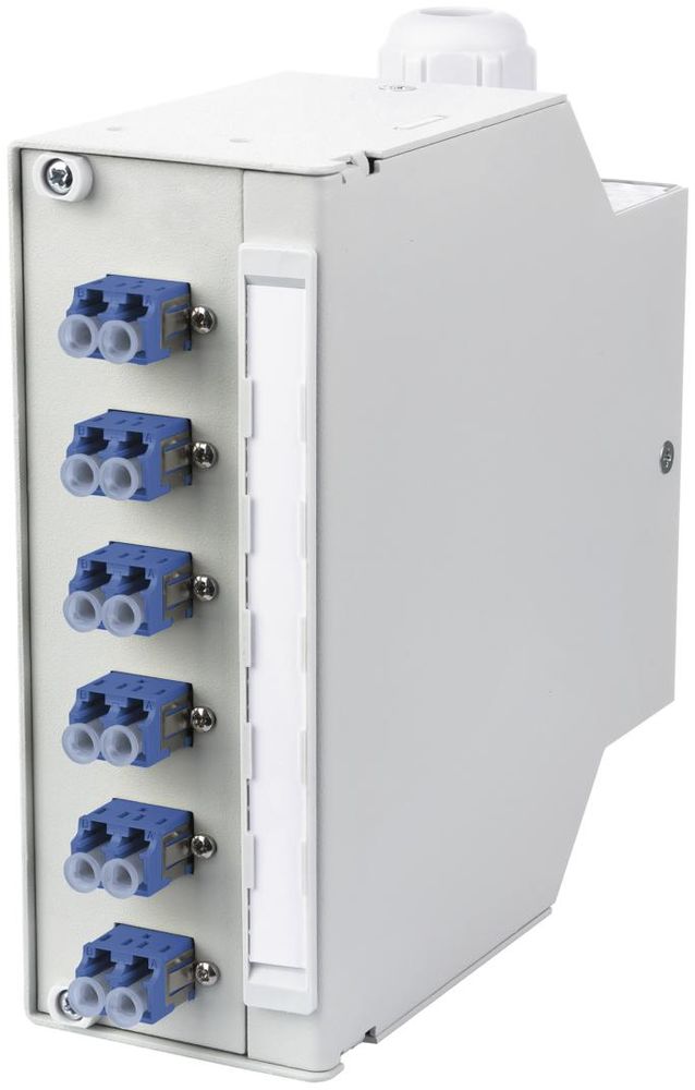 Kompaktes Verteilergehäuse für TH35-Tragschienensysteme, Geeignet zum Spleißen von Installationskabeln, schnellere Installation durch zum Spleißen vorbereitete Pigtails, bestückt mit LC-D Kupplungen und LC-Pigtails, Pigtails mit Kompaktader ø 0,9 mm, 12 Farben, Sekundär- und Primärcoating gleichgefärbt, Länge 2,0 m, Pigtails in Spleißablage mit Crimpspleißhaltern eingelegt und abgesetzt, Pigtails gereinigt und in Kupplungen eingesteckt, Frontbereich mit Beschriftungsstreifen, Verschiedene Montagepositionen am Hutschienensystem möglich, Kabelzuführung von oben oder unten, gerade oder schräg, mit M20-Verschraubung (bis zu 2 möglich), Eine Kabeleinführung M20 mit Zugentlastung im Lieferumfang enthalten, Freie Kupplungsaussparungen mit Blindabdeckungen bestückt, Gehäuse aus Stahlblech, pulverbeschichtet (lichtgrau, RAL 7035), Varianten: bestückt mit maximal 6 LC-D Kupplungen