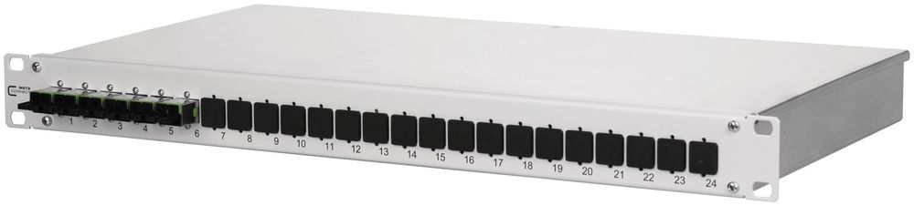 48,3 cm ( 19 Zoll ), 1HE LWL-Patchfeld für Festeinbau, bestückt mit E2000-D-Kupplungen und E2000-Pigtails, Pigtails mit Kompaktader ø 0,9 mm, 12 Farben, Sekundär- und Primärcoating gleichgefärbt, Länge 2,0 m, Pigtails in Standardspleißkassette mit Crimpspleißhaltern eingelegt und abgesetzt, Pigtails gereinigt und in Kupplungen eingesteckt, leichte Aluminium-Konstruktion mit Stahlblech Frontplatte (grau oder schwarz), nicht belegte Ausbrüche mit Blindstopfen verschlossen, abnehmbare Frontplatte zur einfachen Kupplungsmontage, servicefreundliche, verschraubte Abdeckung, mehrere Kabeleingangsmöglichkeiten rückseitig (Befestigung mit PG13,5, PG16 und PG21 bzw. M20 und M25), eine Kabeleinführung M20 ist beigelegt, Varianten: bestückt mit 12 oder 24 E2000-D Kupplungen und Pigtails jeweils blau (OS2) oder E2000-D APC Kupplungen und Pigtails jeweils grün (OS2)