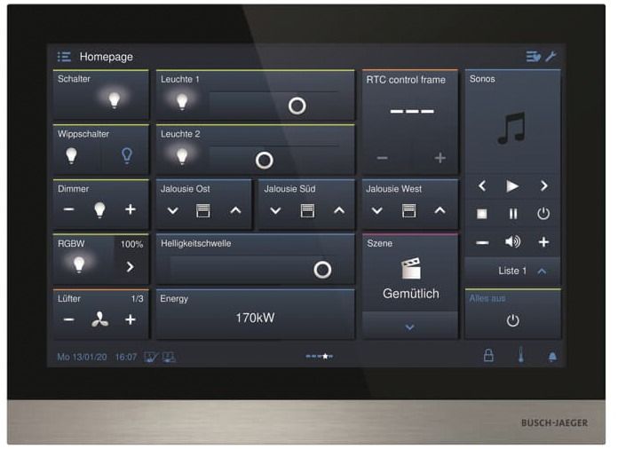 Zur zentralen Steuerung von bis zu 100 konfigurierbaren Busch-free@home® oder Busch-Installationbus® KNX Funktionen vom Typ: Schalten, Dimmen, Jalousie, RTR, Szene, Philips HUE.