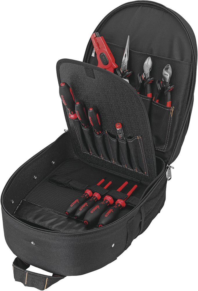Werkzeugrucksack 'Bestückt'. Rucksack zum Transport und zur Aufbewahrung von Werkzeugen, Ausstattungsvielfalt und Verarbeitungsqualität speziell für den Profieinsatz: Kunststoff-Rückenschale mit Komfort-Polsterung, längenverstellbare, gepolsterte Schulterriemen, weitenverstellbarer Beckengurt, 2 Seitentaschen, Dokumenten-Vortasche, zahlreiche Einsteckfächer, Halteschlaufen und herausnehmbare Innentaschen für Werkzeuge, Kleinteile, Dokumente usw. Handtragegriff, 4 stabile Bodengleiter, zahlreiche Einsteckfächer, herausnehmbare Werkzeugtafeln. Belastbarkeit bis zu 15 kg. Leergewicht nur 2300 g (-Artikelnr. 17 0430). Rucksack ist mit folgenden Werkzeugen, je 1x bestückt: 1000 V Telefonzange mit geraden Backen 200 mm, DIN ISO 5745 (10 0216),1000 V Seitenschneider 160 mm, DIN ISO 5749B (10 0574), JOKARI Abisolierzange Super 4 (10 0760), Phasenprüfer 100-250 V AC 3,0/60 mm (11 1280),1000 V Schlitz-Schraubendreher DIN EN 60900 3,0x0,5 mm, 185 mm (11 7702),1000 V Schlitz-Schraubendreher DIN EN 60900 4,0x0,8 mm, 185 mm (11 7704),1000 V Schlitz-Schraubendreher DIN EN 60900 5,5x1,0 mm, 220 mm (11 7705),1000 V Kreuzschlitz-Schraubendreher 80 mm PH 1 DIN 7438 (11 7731)1000 V Kreuzschlitz-Schraubendreher 100 mm PH 2 DIN 7438 (11 7732),1000 V Kreuzschlitz-Schraubendreher 80 mm PZ 1 (11 7741),1000 V Kreuzschlitz-Schraubendreher 100 mm PZ 2 (11 7742),Kabelschere DUOCUT 160 mm, mit zweistufigem Schneidenbereich (12 0108), JOKARI Kabelmesser mit Hakenklinge, mit einem Ø von 8 - 28 mm (12 1010). Tasche bestückt mit einem Gewicht von 3.400 g, Außenmaß B/T/H: 480/220/380 mm.