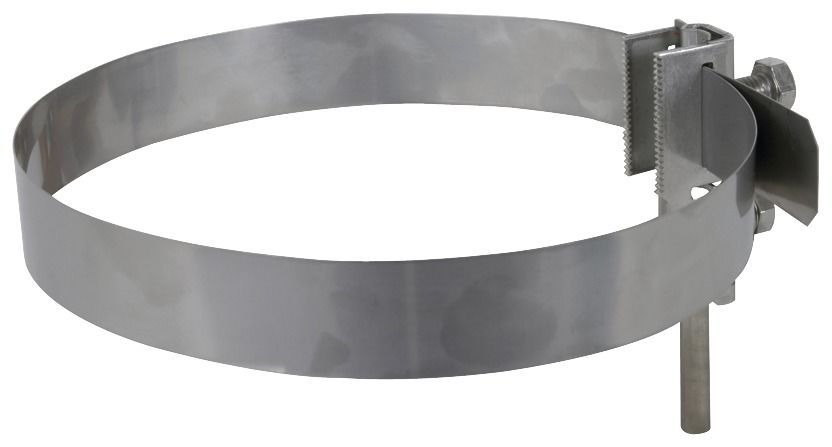 BS-Bandrohrschelle mit Zacken, nach DIN EN 62561-1, zum Einbinden von Rohren in den Schutz und Funktionspotentialausgleich nach DIN VDE 0100-410/540 und den Blitzschutz-Potentialausgleich nach DIN EN 62305-3 (VDE 0185-305-3). Ausführung mit Zacken, anwendbar für Oberflächen (z. B. Lacke, Pulverbeschichtungen) bis zu einer Schichtdicke von 0,2 mm, komplett mit stetig verstellbarem Spannband aus NIRO, zum Anschluss von 1 Leiter Rd D10 mm oder 1-2 Leiter Rd D6-8 mm oder 4-50 mm² (ein- / mehrdrähtig).