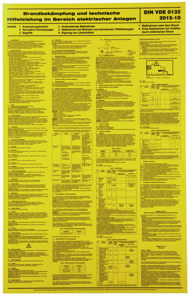 Hinweisschild zum Aushang: 'Brandbekämpfung und technische Hilfeleistung im Bereich elektrischer Anlagen' nach DIN VDE 0132.