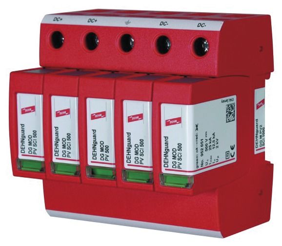 Mehrpoliger Überspannungsableiter DEHNguard M PV2 SCI, Typ 2 nach EN 61643-31 zum Schutz von 2 MPP-Eingängen. Die dreistufige DC-Schaltvorrichtung, bestehend aus Basisteil und gesteckten Schutzmodulen, mit kombinierte Abtrenn- und Kurzschließvorrichtung mit sicherer elektrischer Trennung im Schutzmodul. Zum Schutz von Niederspannungs-Verbraucheranlagen vor Überspannungen. Zum Einsatz gemäß IEC 60364-7-712:2002-05 (Errichten von Photovoltaik-Versorgungssystemen).
