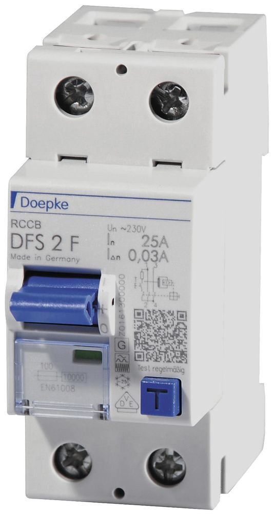 Fehlerstromschutzschalter (RCCB) schalten die Stromversorgung ab, wenn gefährlich hohe Fehlerströme auftreten. Sie schützen so Personen, Tiere und Anlagen. DFS 2 sind zweipolige Fehlerstromschutzschalter für einphasige Netze. In Standardausführung sind die kompakten Geräte zwei Teilungseinheiten schmal. Sie sind mit vielen verschiedenen Fehlerstromtypen und Ausführungen bei Bemessungsströmen bis zu 125 A erhältlich. Die großen Doppelstockklemmen können auch große Leiterquerschnitte aufnehmen. Die Ausgelöststellung des Multifunktionsschaltknebel erleichtert die Fehlersuche. Die kostenlose Etikettensoftware hilft bei der Beschriftung. Schalter des Typs F sind mischfrequenzsensitiv. Sie schützen netzspannungsunabhängig vor Puls- und Wechselfehlerströmen sowie Fehlerströmen mit Mischfrequenzen abweichend von 50 Hz. Sie sind erhöht stoßstrom- und gewitterfest. Geräte in Standardausführung sind für die Überwachung von Stromkreisen mit einer Bemessungsspannung von 230 V und einer Bemessungsfrequenz von 50 Hz ausgelegt. Eigenschaften: sensitiv für Wechsel- und pulsierende Gleichfehlerströme der Netzfrequenz (Typ A) sowie Wechselfehlerströme mit Mischfrequenzen ungleich 50 Hz, hohe Immunität gegen Stoßfehlerströme und netzspannungsgetriebene Folgestromimpulse, geringe Baugröße für alle Bemessungsströme, hohe Kurzschlussfestigkeit, beidseitige Doppelstockklemmen für großen Leiterquerschnitt und Schienenanschluss, Schaltstellungsanzeige, Sichtfenster für Beschriftungsetiketten, Multifunktionsschaltknebel mit drei Positionen: 'ein', 'aus', 'ausgelöst', Anschluss C1 Neutralleiterposition beliebig, Montageart: Schnellbefestigung auf Tragschiene, Einbaulage beliebig, Einspeiserichtung beliebig, Einsatzgebiete: Moderne Hausinstallationen mit LED-Beleuchtungsanlagen sowie einphasigen Frequenzumrichtern, Ideal für Anlagen, in denen RCCB vom Typ A aufgrund von Stoßfehlerströmen zu Fehlauslösungen neigen, Gewerbliche und industrielle Installationen mit TN-S-, TT- und TN-C-S-Systemen, in denen Betriebsmittel der Leistungselektronik ohne galvanische Netztrennung zur Anwendung kommen, wie z. B. Schaltnetzteile, Hochfrequenzstromrichter, Photovoltaik- und