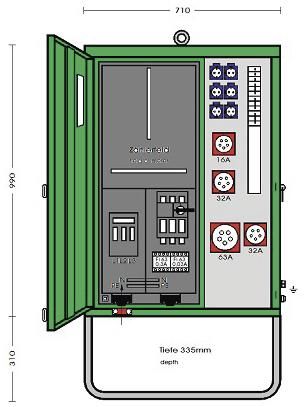 1x FI 63/0,03A Typ B, 2x CEE 532/6h, 1x CEE 516/6h, 6x Schutzkontakt-