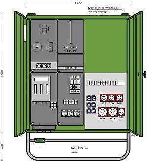 1x FI 63/0,03A Typ B, 2x CEE 532/6h, 2x CEE 516/6h, 6x Schutzkontakt-
