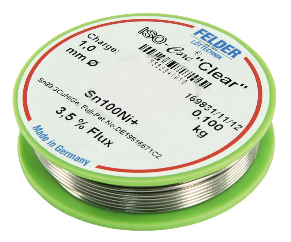 Der Artikel Felder Löttechnik ETT-1540264 Lötzinn auf Rolle FELDER, ISO-Core ''Clear'', 1,0mm, 100g, bleifrei (Sn100%Ni+) ist derzeit auf Lager