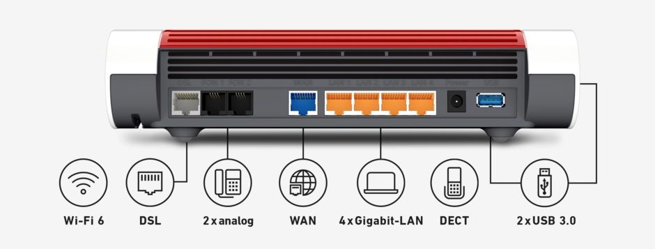 High-End Heimnetz mit 4x4 Wi-Fi 6 (WLAN AX)Die FRITZ!Box 7590 AX mit innovativem Wi-Fi 6 (WLAN AX) bringt ultraschnelles WLAN ins Heimnetz. Der neue Standard Wi-Fi 6 (WLAN AX) ist nochmals schneller und deutlich effizienter: mehrere parallele Anwendungen wie 4K-Streams, Video-Konferenzen und Cloud-Anwendungen meistert die FRITZ!Box 7590 AX mühelos. Ausgestattet mit zukunftssicherem VDSL Supervectoring 35b ermöglicht die FRITZ!Box Internetgeschwindigkeiten von bis zu 300 MBit/s am Anschluss. Gigabit-LAN, USB 3.0 und die DECT-Basis für schnurlose Telefonie und Smarthome-Anwendungen komplettieren das vielseitige Kommunikationsangebot im Heimnetz ab.Innovatives Wi-Fi 6 für ein WLAN mit vielen EndgerätenNeben Smartphones, Notebooks, TVs und Spielekonsolen sind immer mehr Haushalts- und Smarthome-Geräte auf kabellose Verbindungen ausgelegt - ideal für Wi-Fi 6. Durch Verringerung der Latenzzeiten und das neue Modulationsverfahren OFDMA mit QAM-1024 sorgt Wi-Fi 6 (WLAN AX) für mehr Effizienz, höhere Geschwindigkeiten und eine bessere WLAN-Abdeckung in Haus und Wohnung. Insgesamt stellt die FRITZ!Box 7590 AX mit 2.400 MBit/s (5 GHz) + 1.200 MBit/s (2,4 GHz) große Leistungsreserven für alle anspruchsvollen Anwendungen im WLAN bereit. Leistungsstarke Zentrale im WLAN MeshAls WLAN Mesh Zentrale sorgt die FRITZ!Box 7590 AX für beste WLAN-Qualität im gesamten Heimnetz. Im WLAN Mesh werden verteilte WLAN-Knoten (z.B. FRITZ!Box und mehrere FRITZ!Repeater) zu einem einzigen intelligenten WLAN-Netz zusammengefasst. Vielseitiges Smarthome und komfortable TelefonieÜber die integrierte DECT-Basis werden Smarthome-Geräte wie der Heizkörperregler FRITZ!DECT 301, die schaltbaren Steckdosen FRITZ!DECT 200/210, der Taster FRITZ!DECT 440 und die LED-Lampe FRITZ!DECT 500 gesteuert. An der integrierten Telefonanlage können ein Analog-Telefon sowie bis zu sechs DECT-Schnurlostelefone (z. B. FRITZ!Fon) angemeldet werden. Vielseitige Multimedia-FunktionenDie FRITZ!Box 7590 AX bringt auch angeschlo