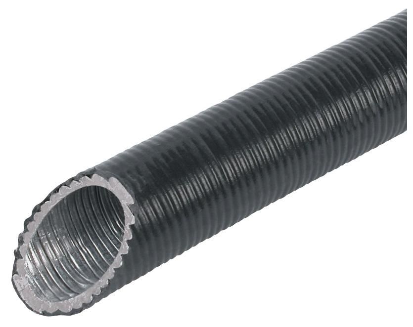 Stahlrohr aus Bandstahl mit enger Rillung, Auf- und Unterputz im Haus- oder Industriebau, sowie im Freien nicht flammenausbreitend, UV-stabilisierter Kunststoffmantel, DIN EN 61386-22, Klassifizierung: 44412mit Kunststoffmantel (UV-stabil)