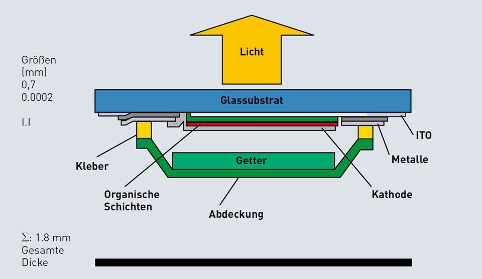 OLED steht für „organic light-emitting diode“ oder „organische Licht-emittierende Diode“. Eine OLED ist ein Dünnschichtelement aus organischen Halbleitern, das unter Strom leuchtet. Der Unterschied zu LEDs, also anorganischen Leuchtdioden liegt in der elektrischen Strom- und Leuchtdichte und im Material der Diode. OLEDs verfügen über eine geringere Leucht- und Stromdichte und verwenden keine einkristallinen Materialen für die Diode. Dadurch lassen sich OLEDs mit einer Dünnschichttechnik kostengünstiger als herkömmliche LEDs herstellen, allerdings ist die Lebensdauer geringer als bei anorganischen LEDs.