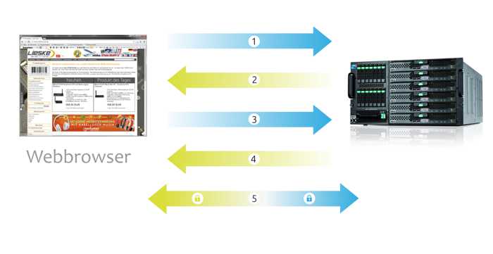 - Der Browser baut eine Verbindung zu einem mit SSL (https) gesichert Web-Server (Website) auf. Der Browser fordert, dass der Server sich identifiziert.