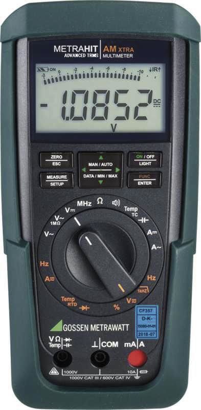 TRMS System Multimeter mit 12.000 Digits Digitalanzeige, Datalogger und IR-Schnittstelle. Das METRAHIT AM XTRA ist das Top Gerät der METRAHIT Advanced Multimeter Serie. Die Multimeter der METRAHIT AM Serie: METRAHIT AM BASE, PRO, TECH und XTRA sind absolut robuste und zuverlässige Digitalmultimeter mit Gehäusen aus schlagfestem Kunststoff. Die Geräte präsentieren sich in attraktivem Design und mit der neuesten Technik. . Das METRAHIT AM XTRA ist das Top Gerät der METRAHIT Advanced Multimeter Serie. Spitzentechnik bis ins Detail: Die robusten Digital-Multimeter der METRAHIT AM Serie bieten in jeder Hinsicht überzeugende Leistungsmerkmale. Sie sind mit modernster Technik ausgestattet und gewährleisten hochpräzise Ergebnisse. Ihr ergonomisches Design sorgt für ein Maximum an Bedienungsfreundlichkeit und Sicherheit. Mit ihrem breiten Funktionsspektrum sind sie für anspruchsvolle Messaufgaben in vielen Bereichen optimal geeignet.. TRMSAC, AC+DC Messung bis 20 kHz für Spannung und StromDatenlogger und IR-Schnittstelle zum PCNetzteilanschluss. Universell einsetzbar in allen Bereichen der Elektrotechnik! Echteffektivwertmessung bis 20 kHz mit 12000 Digits Digitalanzeige und Analogskala Messung von Spannung und Strom, DC, AC und ACDC, Widerstand, Temperatur, Frequenz, Tastverhältnis, Kapazität, Durchgang / Dioden Clip-Funktion für die Strommessung mit Stromsensoren und-wandlern Automatische Messbereichswahl und Messwertspeicherung Sicherheit für den Anwender und das Gerät in den Messkategorien CAT IV bis 600V und CAT III bis 1000V. . Das Multimeter eignet sich für den universellen Einsatz in der Elektrotechnik, in den Bereichen Elektroinstallation, Labor, Fernmeldewesen, Schulung, usw.Das Gerät ist feldtauglich und besitzt eine interne netzunabhängige Stromversorgung. Der zusätzliche Netzteilanschluss ist ideal für Langzeitmessungen und Laboreinsatz.. Auflösung ± 12000 Digits, 4½ stellig 3 Buchsen mit automatischer Buchsensperre ABS (patentiert) TRMS AC und AC / DC-Funktion Spannungsmessung mit einer Grundgenauigkeit von ±0,05% (VDC) Automatische und manuelle Messbereichswahl Automatische Messwertspeicherung DATA / MIN / MAX großes, lichtblau beleuchtetes Display mit extra großen Ziffern (15mm) und analogem Bargraph für dynamische Vorgänge getrenntes Batterie- und Sicherungsfach Staub- und Wasserschutz nach Schutzart