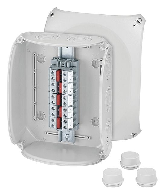 Kabelabzweigkasten aus hochwertigem Thermoplast mit Klemmen für Aluminium- und Kupferleiter. Für Aufputz-Anwendungen in Gebäuden oder die geschützte Installation im Freien. Mit Klemmen bis 16 mm², 5-polig. Kabeleinführungen über metrische Vorprägungen in Gehäusewänden und Boden. Beigefügte Einsteckstutzen in Schutzart IP 55. Mit Außenlaschen zur Befestigung und Deckelbefestigung über Schnellverschlüsse.