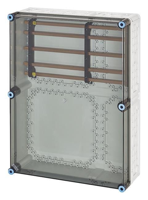 Gehäuse für den Bau von Energie-Schaltgerätekombinationen bis 630 A oder als Einzelgehäuse. Aus hochwertigem Polycarbonat schutzisoliert. Wanddurchführungen mit großen Öffnungen für die elektrische Verbindung der Gehäuse untereinander. Kabeleinführung an allen Gehäusewänden über metrische Vorprägungen oder Anbauflansche. Gehäuse zur Wandbefestigung auch über Außenlaschen oder mit Montageschienen. Gehäuse mit Sammelschienen, ohne Gerät, ohne Klemmen. Deckelverschlüsse für Werkzeugbetätigung.