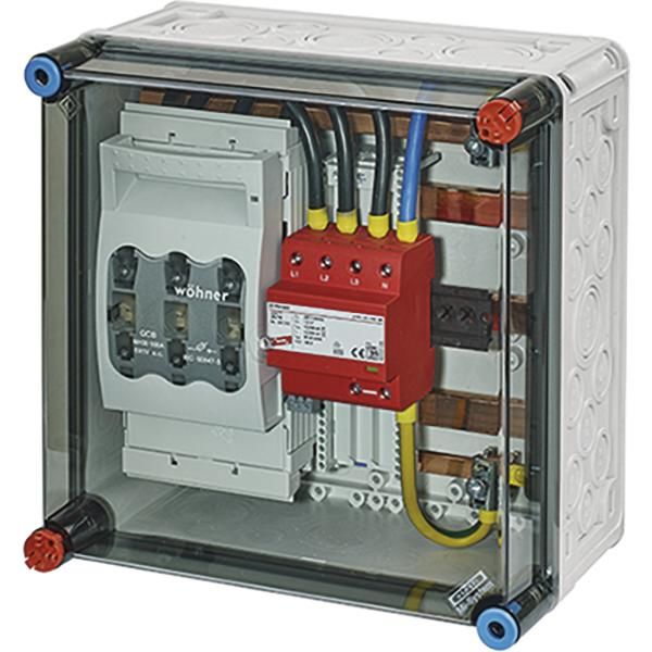 Funktionsgehäuse als Überspannungsschutzgehäuse mit 1 x Überspannungsableiter Typ 1+2 und Sicherungslasttrennschalter NH 00. Deckelverschlüsse für Werkzeugbetätigung.