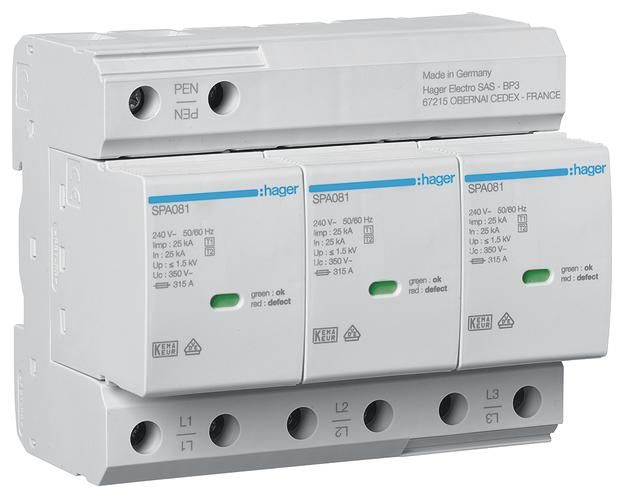 Hager SPA800 Kombiableiter T1+T2 3P 350V Iimp 25kA Up 1.5kV TNC