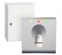 Das verwendete Gehäuse des BioKey Gate mit einer Fingerführung aus Edelstahl im modernen Design umschließt den robusten Atmel Zeilensensor, der Einbau an der Wand ist extrem einfach.
