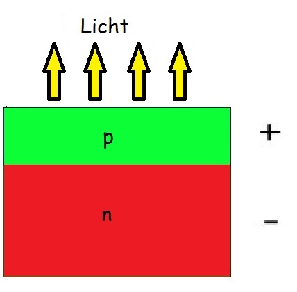 Man nehme sich einen reinen Halbleiterkristall in dem sich immer gleich viele Leitungselektronen wie Elektronenlöcher befinden. Die Anzahl der freien Ladungsträger lässt sich durch Zugabe (Dotieren) einiger fremdatome steigern. Das nennt man dann "dotierter Halbleiter". Durch Zugabe von 5-wertigen Fremdatomen (Ladungsspender - Donatoren) erhält man Elektronen Überschuss (p-leiter). Durch den umgekehrten Einbau von nur 3 wertigen Fremdatomen (Ladungsaufnehmer - Aktzeptoren) erhält man Elektronen Mangel (n-leiter). Man verbindet nun den n & p Leiter durch ein winziges stück Edelmetall und legt eine Spannung an. Elektronen aus n/p Schicht wandern nun durch den pn Übergang und rekombinieren sich - Elektronen werden von den Löchern wieder eingefangen und an ihre Gitterplätze gebunden. Bei diesem Vorgang wird Energie frei welche sich als Licht abstrahlt.