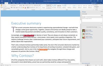 Office 2016 sorgt dafür, dass alle Mitarbeiter auf demselben Stand sind. Dabei helfen einem die Co-Authoring-Funktionen in Word, PowerPoint und OneNote. Diese sind für Dokumente verfügbar, die auf OneDrive, OneDrive for Business oder SharePoint Online gespeichert wurden, und ermöglichen mehreren Personen die gleichzeitige Bearbeitung desselben Dokuments. Mit der Funktion für das Tippen in Echtzeit in Word sehen Sie zudem genau, woran andere Nutzer gerade in einem Word-Dokument arbeiten, da neue Eingaben und Änderungen simultan angezeigt werden.