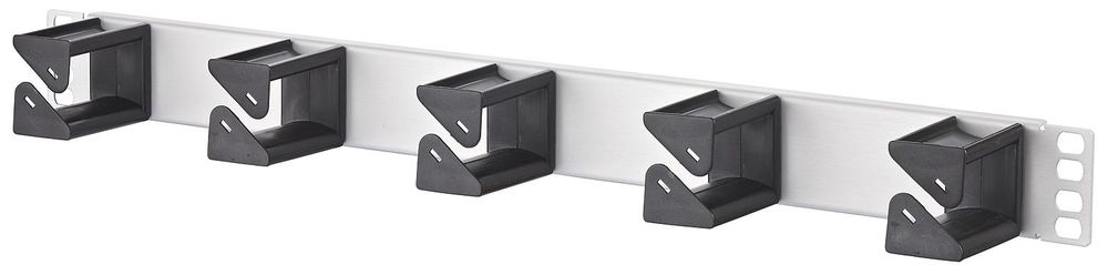 Rangierfeld 48,3 cm ( 19 Zoll ) 1HE, Kabelmanagement zum horizontalen rangieren der Patchkabel, Kabelführungsbügel 56,0 mm, besonders geeignet auch für LWL-Patchkabel, 5 schwarze Kabelführungsbügel aus Kunststoff mit großen Auflageflächen, einfache Montage der Kabelführungsbügel durch verdrehen, optional erhältlich: aufsteckbare Beschriftungsleiste, Varianten: Stahl pulverbeschichtet grau oder schwarz, Aluminium silber eloxiert, Edelstahl