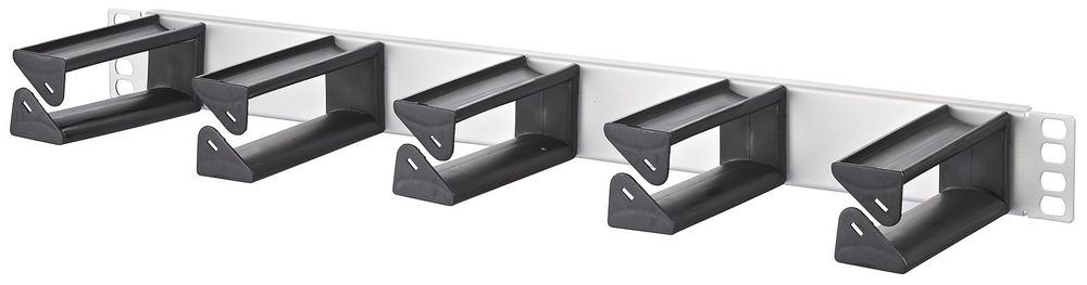 Rangierfeld 48,3 cm ( 19 Zoll ) 1HE, Kabelmanagement zum horizontalen rangieren der Patchkabel, Kabelführungsbügel 100 mm, Besonders geeignet auch für LWL-Patchkabel, 5 schwarze Kabelführungsbügel aus Kunststoff mit großen Auflageflächen, Einfache Montage der Kabelführungsbügel durch verdrehen, Optional erhältlich: aufsteckbare Beschriftungsleiste, Varianten: Stahl pulverbeschichtet grau oder schwarz, gebürstetes Aluminium silber eloxiert, Edelstahl