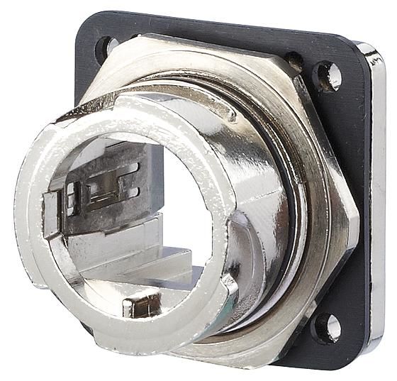 Flansch mit Bajonettverschluss nach Norm ISO/IEC 24702 und IEC 61076-3-106 Var. 1, einfach zu montieren durch runde Wandausschnitte mit am Markt vorhandenen Einsätzen für Lochhandzange, Befestigungsart Zentralverschraubung, Alternative Befestigung mit 4 Schrauben (M3), nicht im Lieferumfang enthalten, front- und rückseitig montierbar, industrietaugliches Metallgehäuse mit erhöhter Robustheit, Brennbarkeitsklasse nach UL 94V-0, bessere Chemikalienbeständigkeit, Erdung über Flachstecker 2,8 mm am RJ45-Einsatz möglich, eine Ausführung für alle Flansch-Einsätze, passende Einsätze: E-DAT Industry RJ45 field jack insert (T568A, T568B oder Profinet), E-DAT Industry RJ45 coupler insert, E-DAT Industry USB coupler insert, OpDAT Industry SC-RJ/2SC adapter insert oder OpDAT Industry LC-D adapter insert