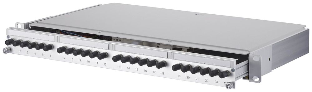 48,3 cm ( 19 Zoll ), 1HE LWL-Patchfeld mit ausziehbarer Spleißablage/Frontblende (grau oder schwarz), bestückt mit ST-Kupplungen und ST-Pigtails, Pigtails mit Kompaktader ø 0,9 mm, 12 Farben, Sekundär- und Primärcoating gleichgefärbt, Länge 2,0 m, Pigtails in Standardspleißkassette mit Crimpspleißhaltern eingelegt und abgesetzt, Pigtails gereinigt und in Kupplungen eingesteckt, Auszug zur besseren Montage abkipp- und komplett herausnehmbar (Auszugsstopp), leichte Aluminium-Konstruktion, nicht belegte Ausbrüche mit Blindstopfen verschlossen, variable Kabeleinführung (gerade/schräg) beidseitig möglich, Kabelabfangung mittels mitgeliefertem Kabelbinder oder optionaler Kabelverschraubung möglich, Kabeldurchmesser 3 bis 20 mm, Zugentlastung für Zentralelement/Kevlar, Kabelmanagement durch frei positionierbare Führungselemente, schraubenlose Abdeckung, Sichtfenster für beiliegende Beschriftungseinlagen, Varianten: bestückt mit 12 oder 24 ST Kupplungen und Pigtails jeweils metallisch (OS2, OM4 oder OM3)