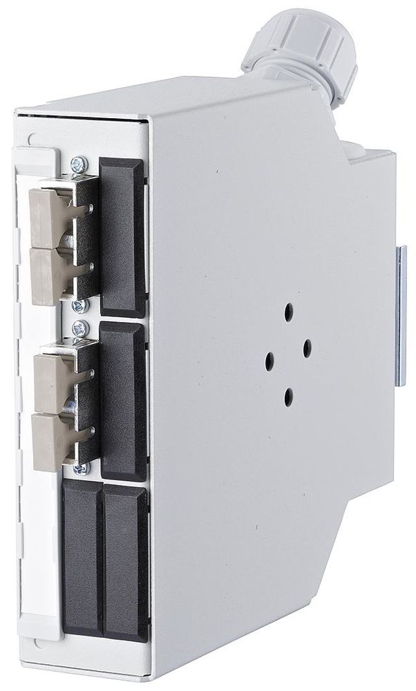 Spleißverteiler für Tragschiene TH35, bestückt mit SC-D (MM) Kupplungen aus Zinkdruckguss, Führungshülse aus Keramik geschlitzt für Multimode Anwendungen, mit Faserreservoir , frei beschriftbarer Beschriftungsstreifen, verschiedene Einbauvarianten auf der Tragschiene möglich, Spleißablage mit Schrumpfspleißhalter, Frontplatte kann als Ganzes herausgenommen werden, Kabelzuführung von oben oder unten, gerade oder schräg, mit M20-Verschraubung (bis zu 2 möglich), Einführung von vorkonfektionierten Kabeln möglich, Eine Kabeleinführung M20 mit Zugentlastung im Lieferumfang enthalten, Befestigung des Gehäusedeckels über nur eine unverlierbare Schraube, Freie Kupplungsaussparungen mit Spezial-Blindabdeckungen bestückt, Varianten: bestückt mit 2, 3, 4 oder 6 SC-D Kupplungen