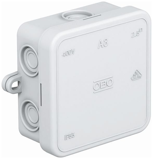 Der Artikel OBO Bettermann 2000016 OBO A 8 Kabelabzweigkasten 75x75x36 PE lichtgrau RAL7035 ist derzeit auf Lager