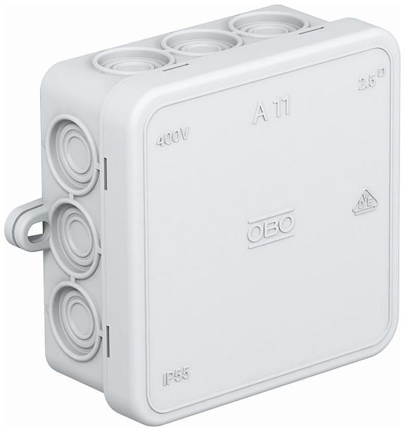 Der Artikel OBO Bettermann 2000342 OBO A 11 Kabelabzweigkasten 85x85x40 PE ohne Klemmleiste lichtgrau RAL7035 ist derzeit auf Lager