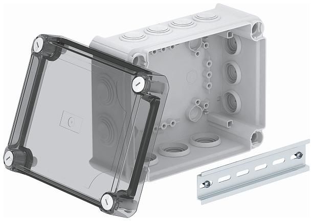 Kabelabzweigkasten gemäß DIN EN 60670. Flammwidrig nach DIN EN 60695-2-11, Prüftemperatur 650°C. Schlagfestigkeit IK05 gemäß DIN EN 50102.