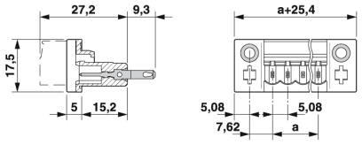 Außen: Steckanschluss für entsprechende MSTB 2,5- oder FKC 2,5-SteckerBefestigung in bis zu 6 mm dicken Gehäusewänden ist mit zwei M3 x 10 Schrauben möglich