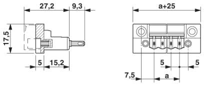 Außen: Steckanschluss für entsprechende MSTB 2,5- oder FKC 2,5-SteckerBefestigung in bis zu 6 mm dicken Gehäusewänden ist mit zwei M3 x 10 Schrauben möglich