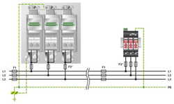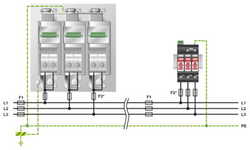 Blitzstrom- / Überspannungsableiter, gem. Typ 1/2 / Class I/II, für 3-phasige Stromversorgungsnetze mit kombiniert verlegtem PE und N in einem Leiter (L1, L2, L3, PEN).
