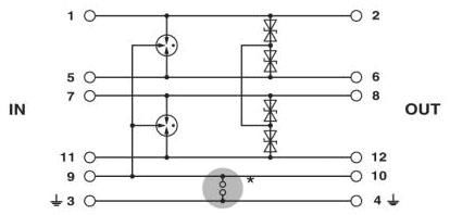 Schutzstecker PT mit Schutzschaltung für einen 4-adrigen erdpotenzialfrei betriebenen Signalkreis. Nennspannung: 12 V DC