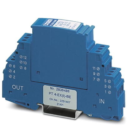 Basiselement für Schutzstecker PT mit Schutzschaltung für einen 4-adrigen erdpotenzialfrei betriebenen EEx ia-Signalkreis. Nennspannung: 24 V DC, Montage auf NS 35/7,5 und NS 35/15, Gehäusebreite: 17,5 mm