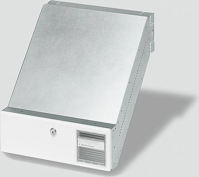 Durchwurfbriefkasten nach DIN EN 13724 im Baukastensystem für Mauereinbau (trockenes Mauerwerk) aus feuerverzinktem Stahlblech 0,8 mm, in schräger 45°-Ausführung, ausziehbar von 290 bis 440 mm, neben- und übereinander anreihbar.